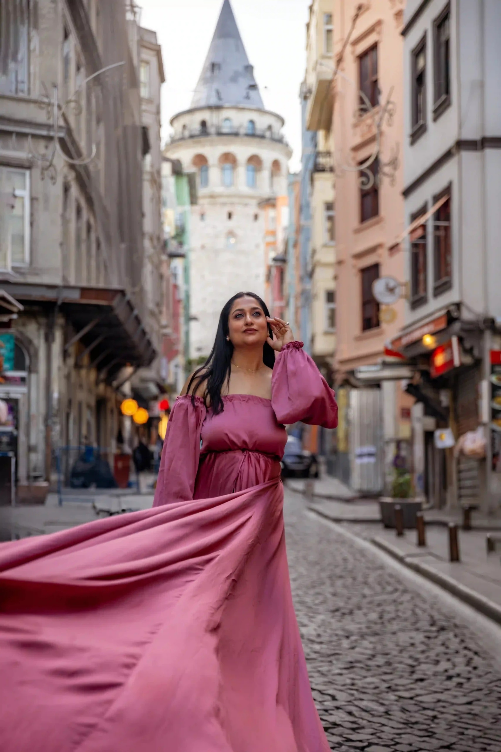 Galata Street—just like the Ortakoy waterfront—because of its colorful walls, its stone pavements that are smoother than Ortakoy, and the calm presence of the tower, is one of the rare streets where this dress looks natural and cinematic, not exaggerated.