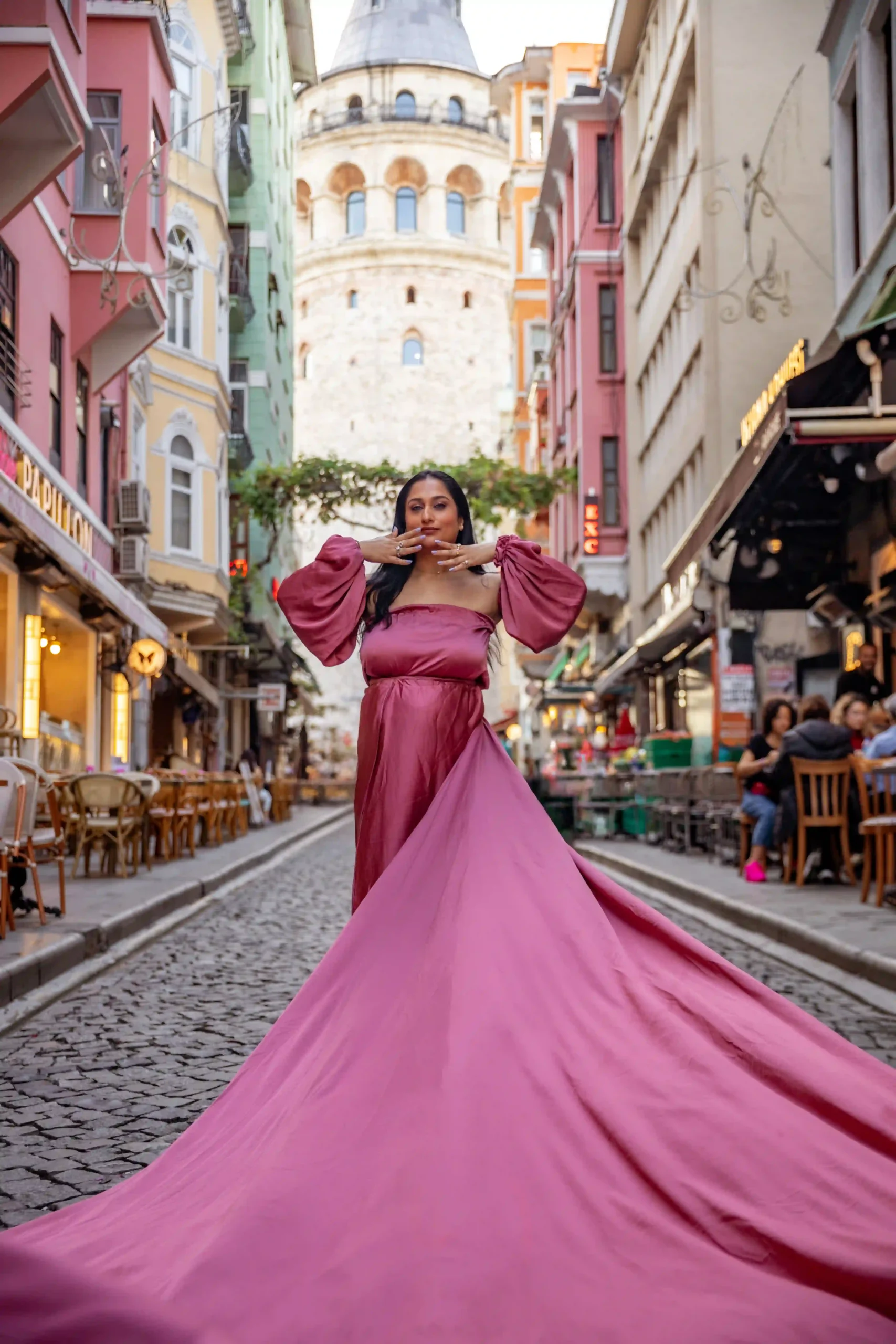 The best hours for a flying dress in Galata are early morning—from around sunrise until two hours after. In this window, the light is soft and controllable; Galata Street is quieter; and the movement of the dress looks more natural and more pleasing.